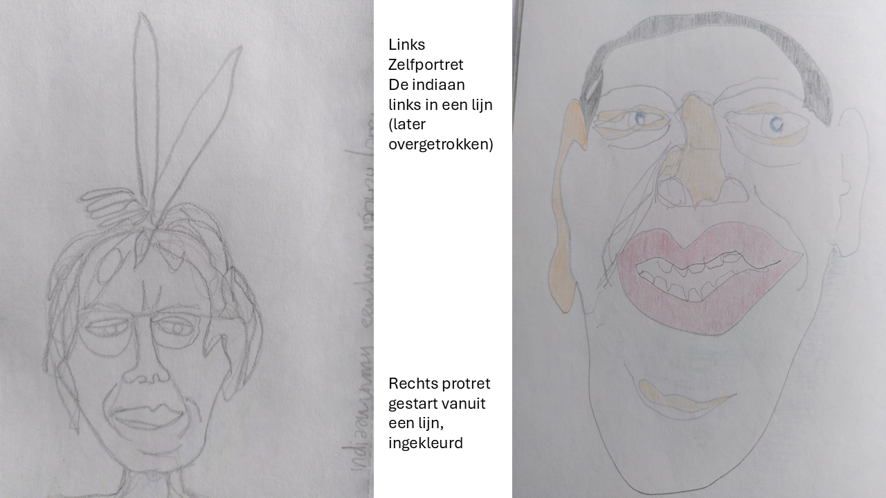 Afgelopen zomer heb ik elke dag een of meerdere tekeningen gemaakt. Veel zelfportretten. Wat ik erg leuk vind is om het potlood ergens neer te zetten en mijn hand de vrijheid te geven wat ze wil maken. Vaak in een lijn en soms een beetje smokkelend worden het er toch twee of meer….